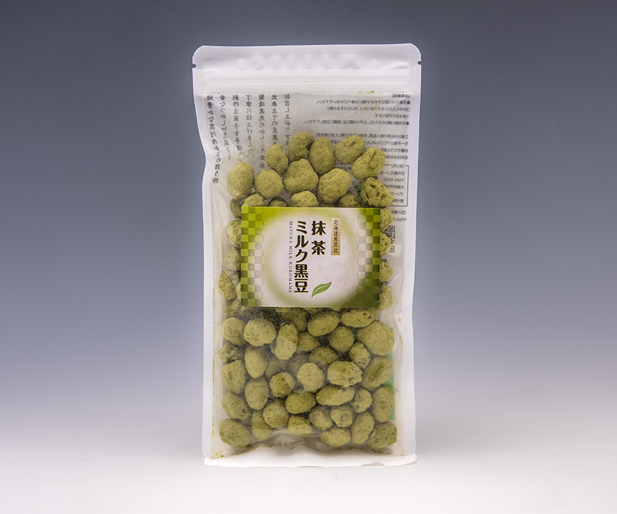 柔らかい黒豆甘納豆にミルクチョコをかけた甘さを抹茶で包み込みました。